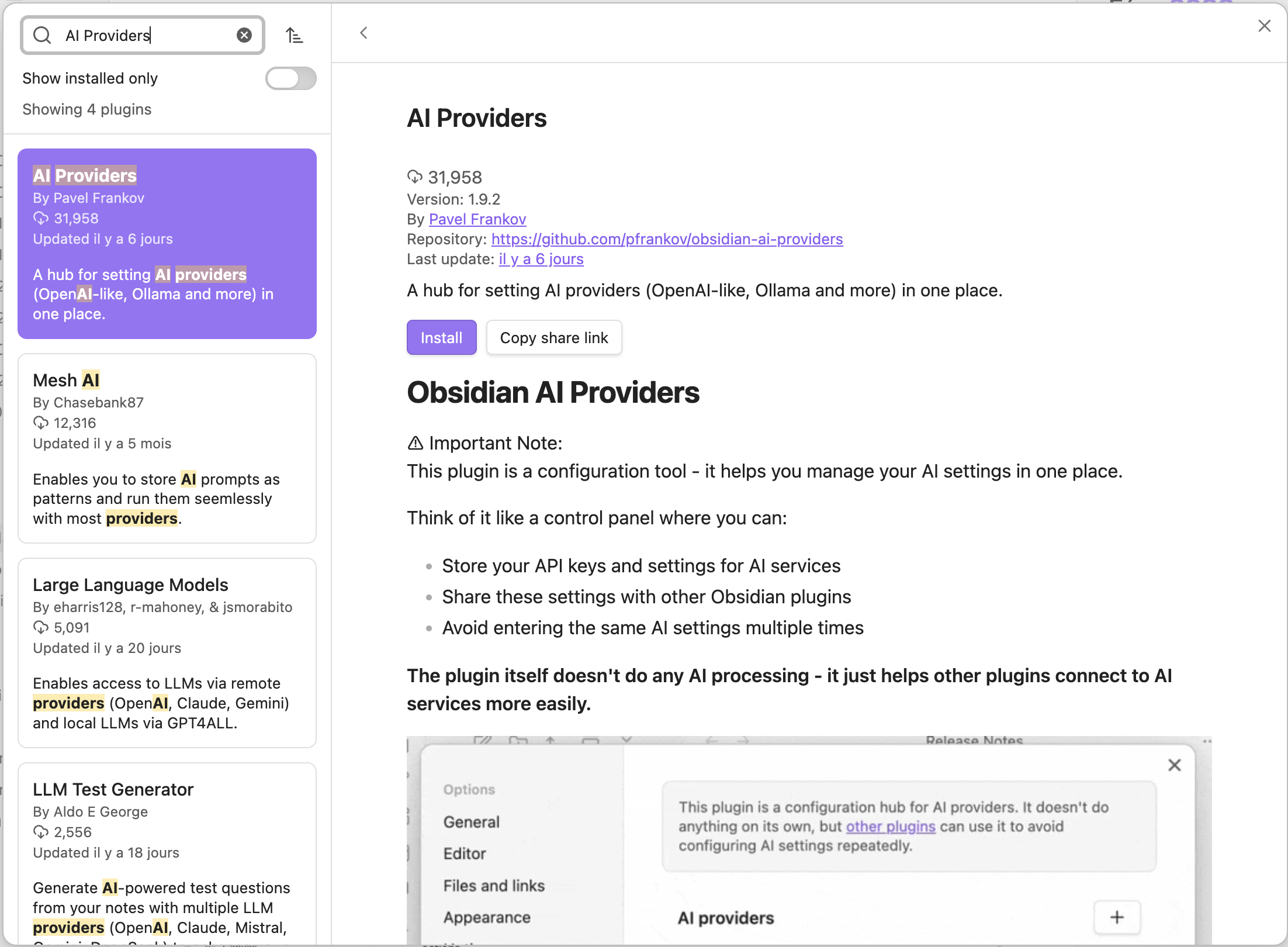 In Obsidian, go to “Settings → Community Plugins → Browse” and search for “AI Providers”.