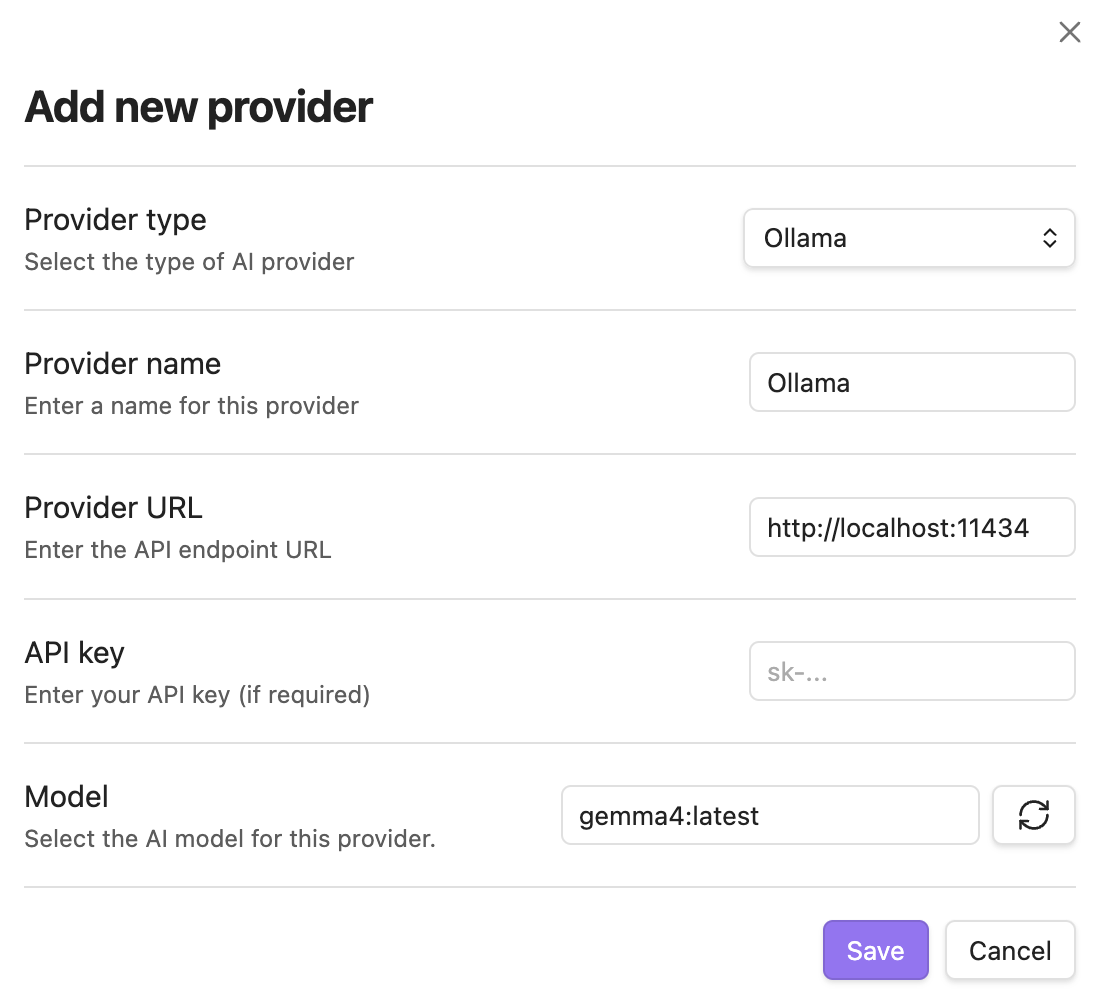 - In the “Main AI Provider”, “Embedding AI Provider”, and “Vision AI Provider” sections, select “Ollama ~ gemma4:latest” from the dropdown.