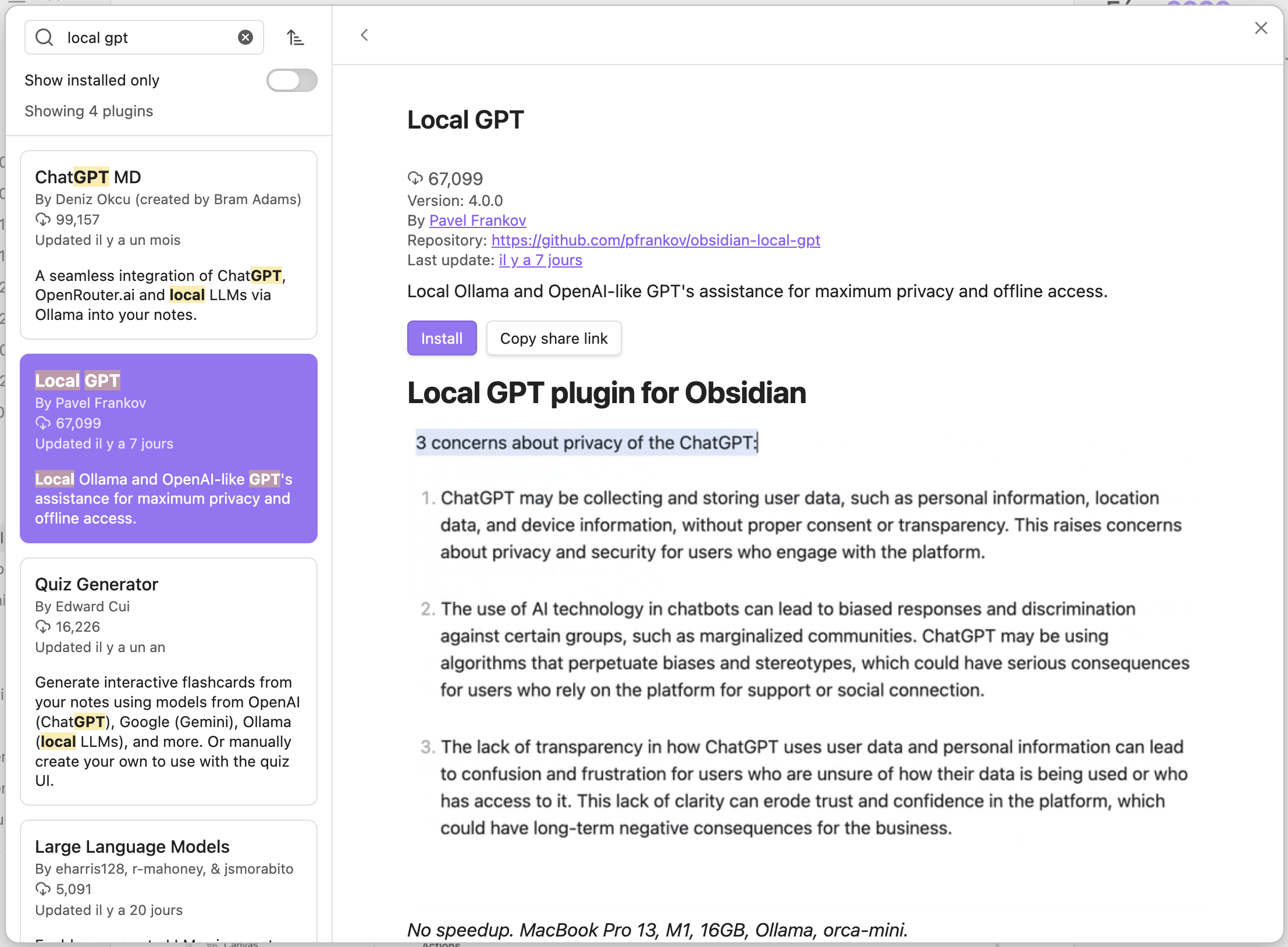 Section titled “Local GPT”Then, install the Local GPT plugin.