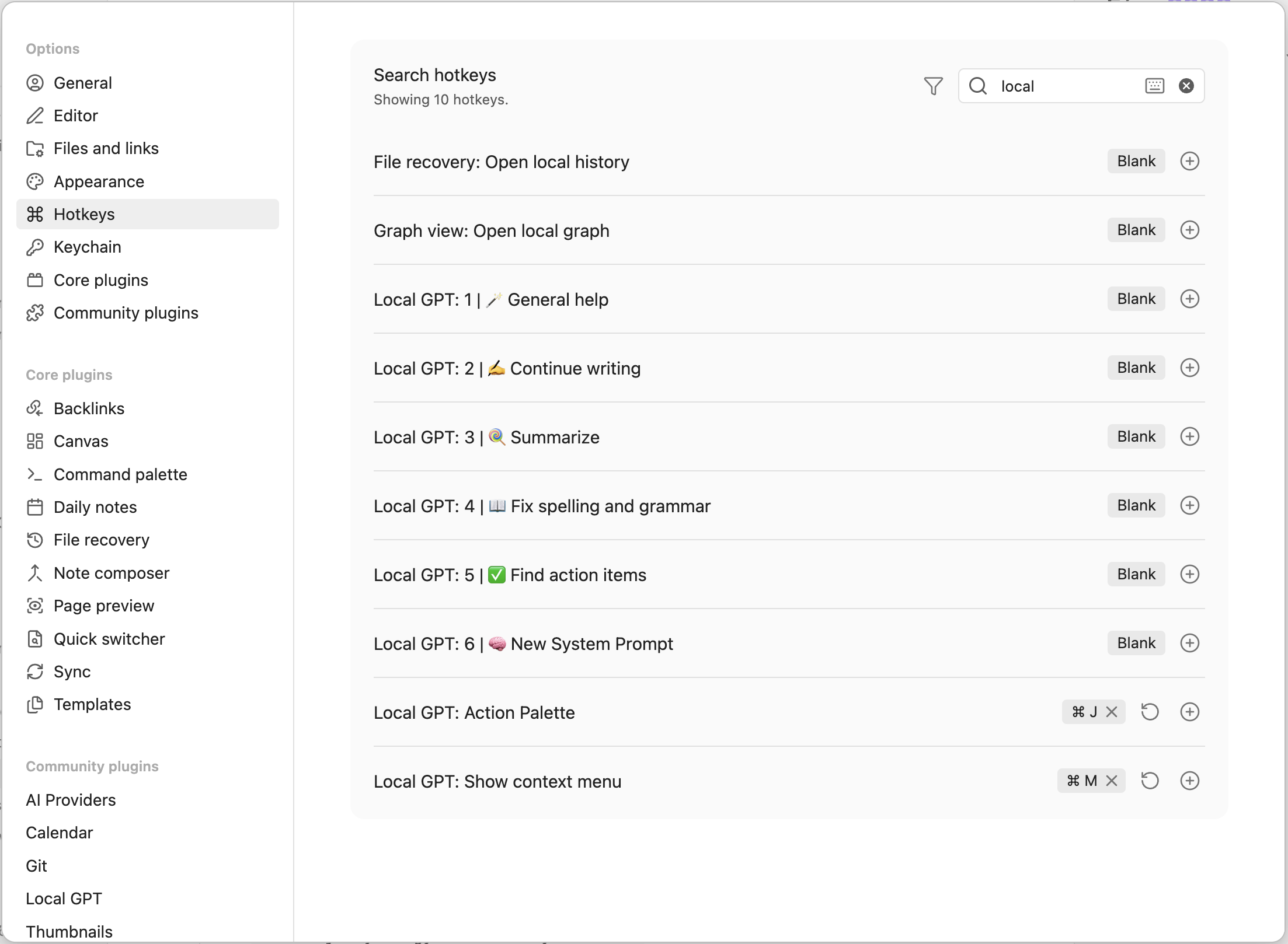 - For “Local GPT: Action Palette”, click on ”+” and press your desired key combination (e.g., ⌘ + J).