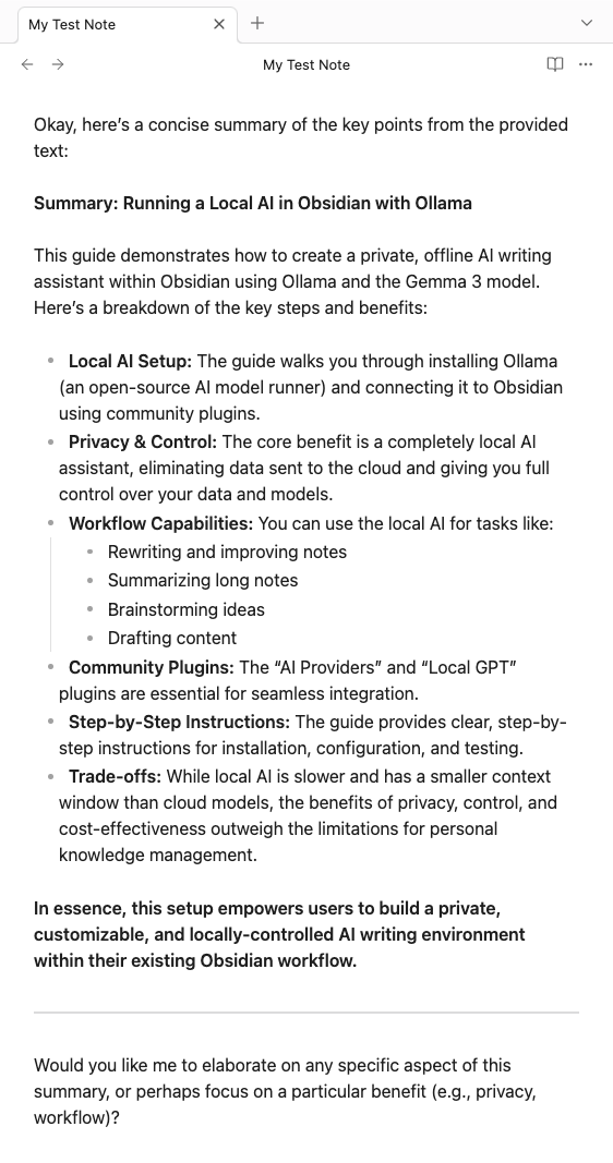 Section titled “Step 4: Test Local GPT Inside Obsidian”Now that everything is set up, it’s time to test Local GPT inside Obsidian.